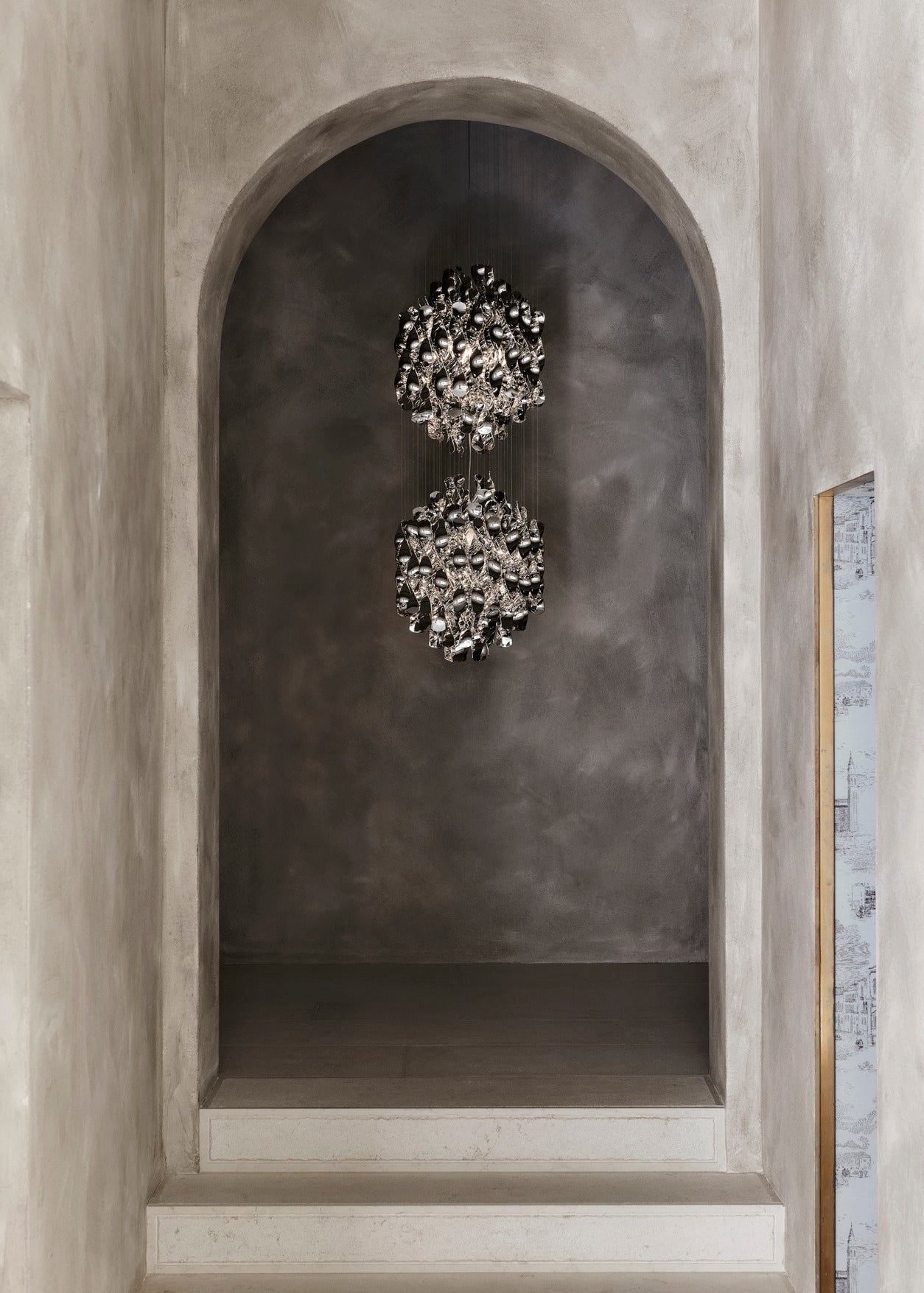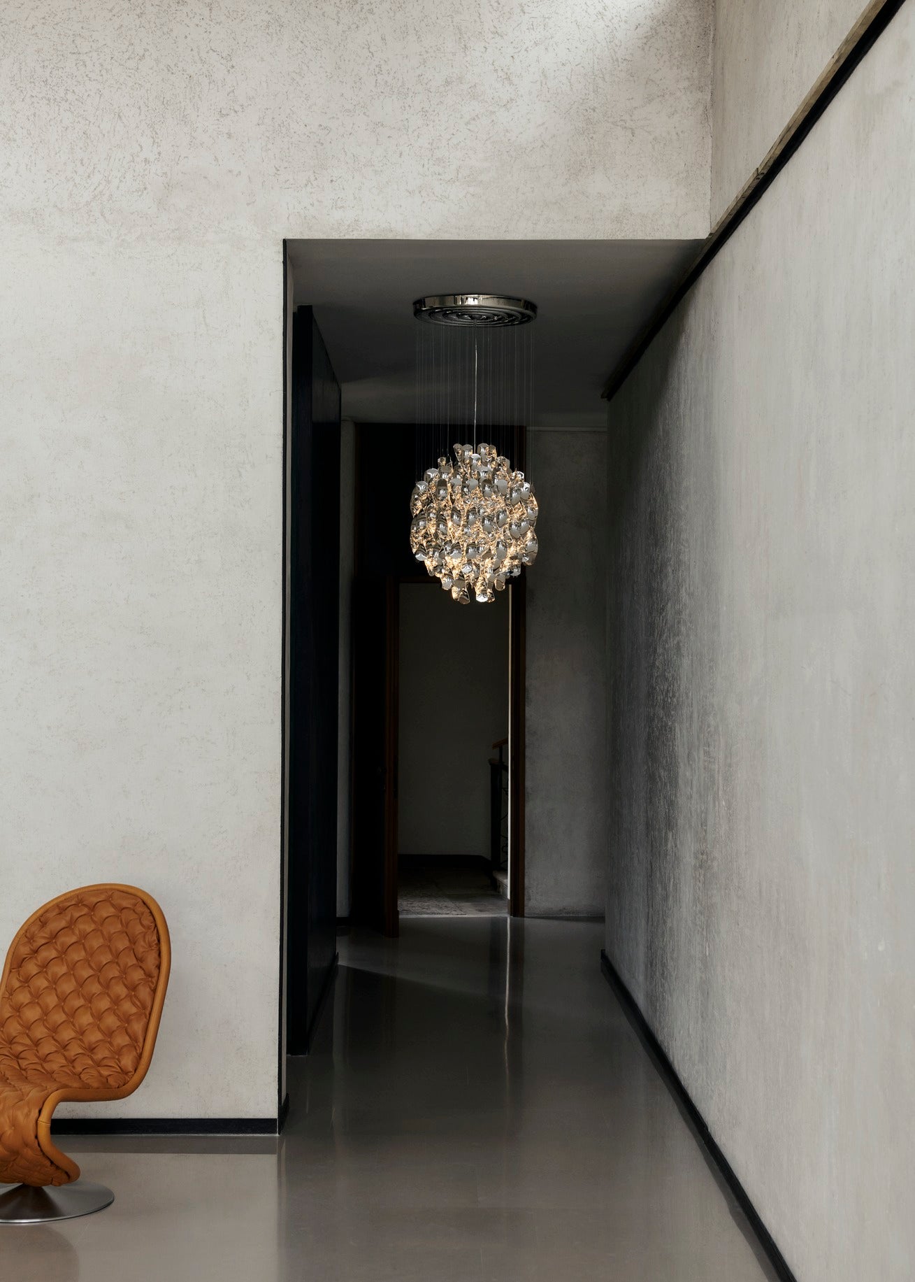 Spiral SP2 hængelampe fra Verpan. Lampen er designet af Verner Panton i 1969 og består af to klynger af enten sølv eller guld spiraler (akryl), fastgjort med nylon snore.