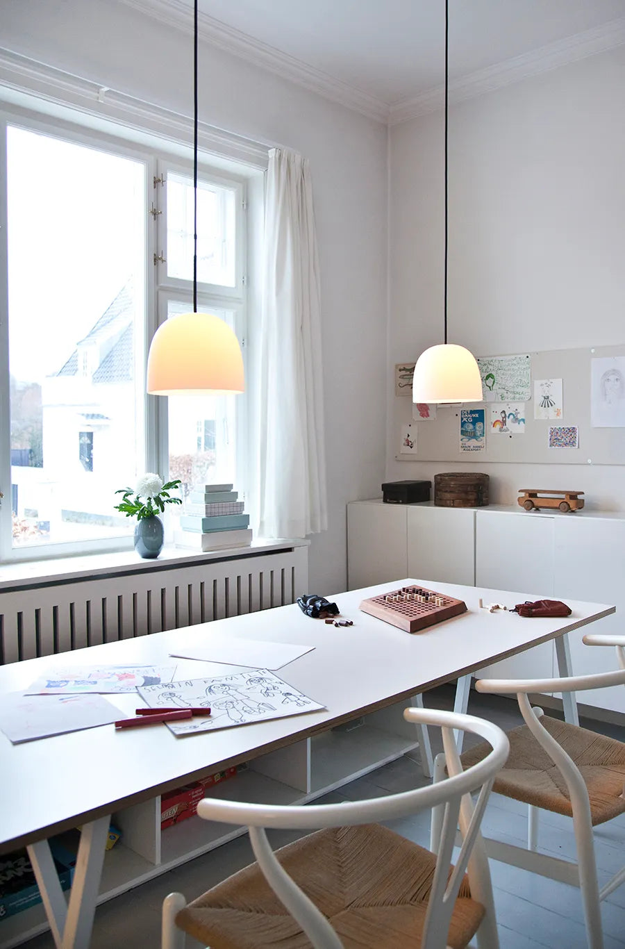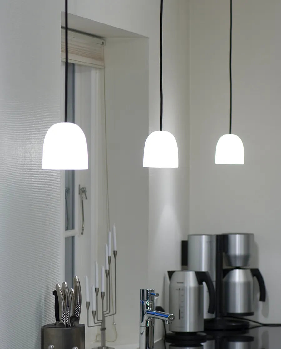 Super pendlen fra Piet Hein fås i tre størrelser med 3 meter sort, hvid eller rød tekstilledning. Skærmens længde skjuler raffineret pæren, uden at lyset går tabt, fordi det både strømmer ud af åbningen i bunden og igennem selve skærmen.
