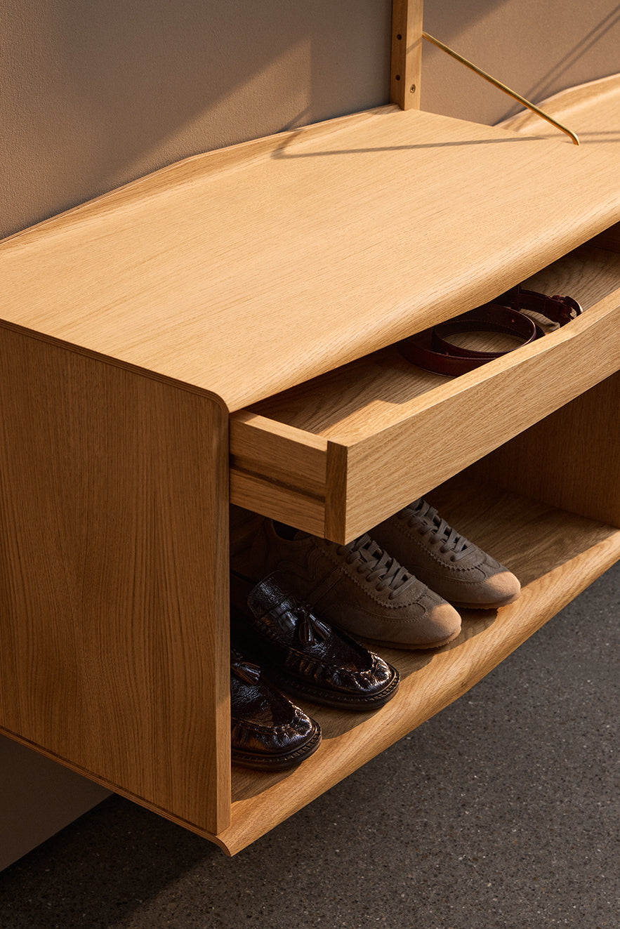 Modulet passer perfekt i stuen som en elegant base til bøger, keramik og kunstobjekter, i hjemmekontoret til notesbøger og kabler, eller i entréen hvor nøgler, handsker og solbriller skal være lige ved hånden, men ikke nødvendigvis i fokus. Udtrykket er karakteristisk for System Ultra: ultratynde elementer og en raffineret bølget kantprofil, som giver møblet et organisk og næsten svævende præg. Vælg mellem eg olie eller valnød olie alt efter om du ønsker et lyst, nordisk look eller en dybere og mere varm stemning.