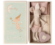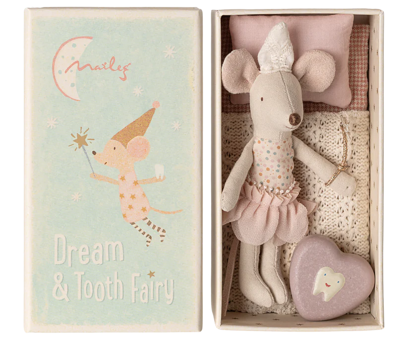 Lad barnets tab af mælketænder blive et magisk øjeblik med Maileg Tandfe Mus “Lillesøster” i sin charmerende tændstikæske – en unik gaveidé, der forvandler en almindelig tand under hovedpuden til et eventyr. Den lille mus er klædt i pudderfarvet tylskørt, prikket overdel og en glitrende tryllestav, og hun bor i sin egen tændstikæskeseng med dyne og pude – klar til at bytte barnets tand mod en lille overraskelse og drysse drømmestøv. Med medfølgende hjerteformet metalæske til opbevaring af tanden er dette sæt både et fantasifyldt stykke legetøj og et kærkomment ritual, som skaber tryghed og glæde for dit barn. Tid til leg, minder og magi.