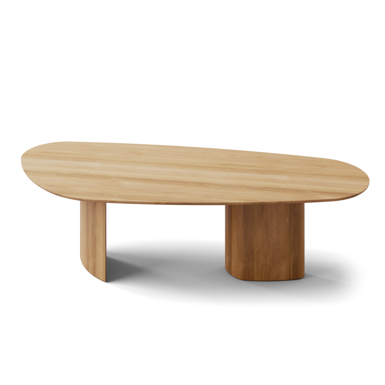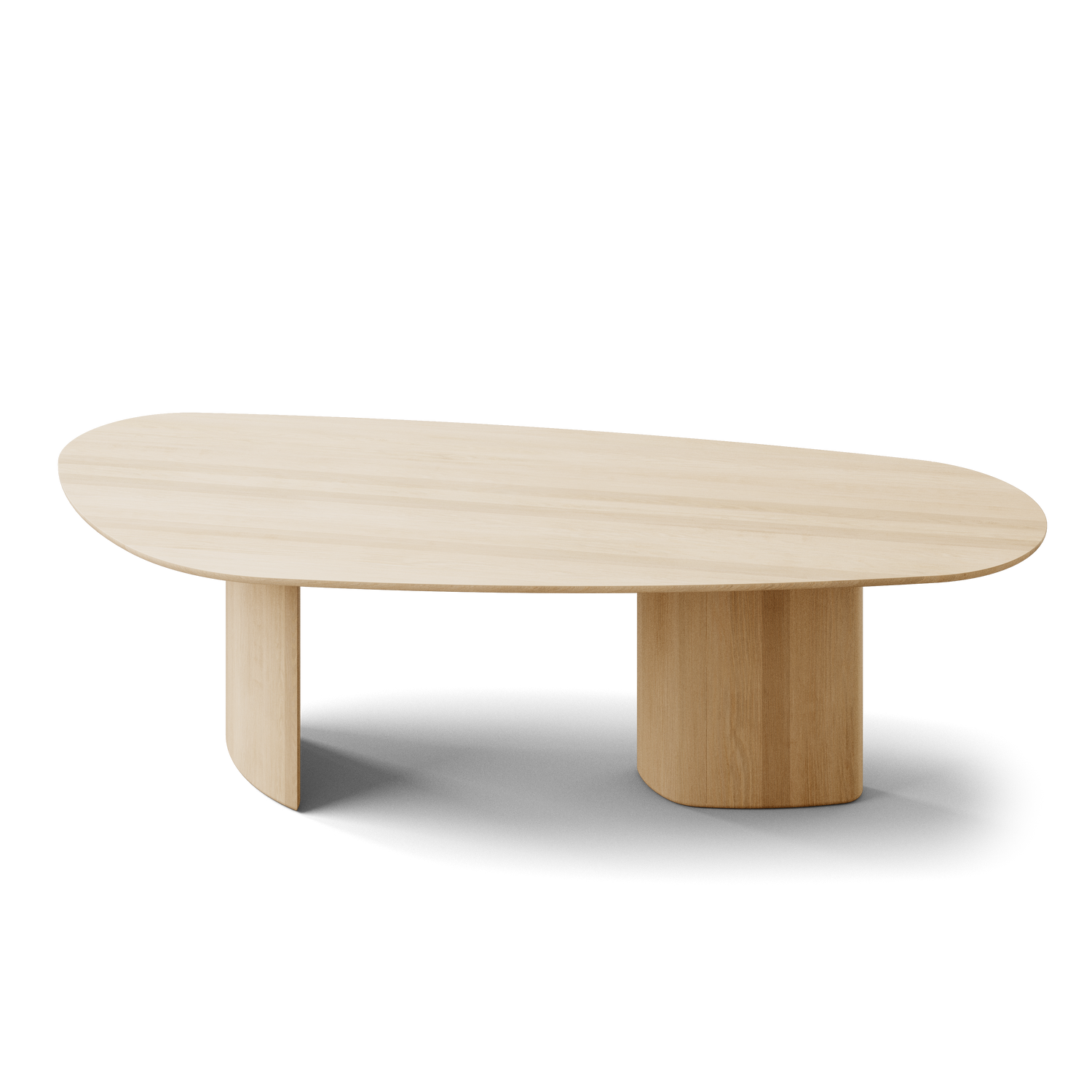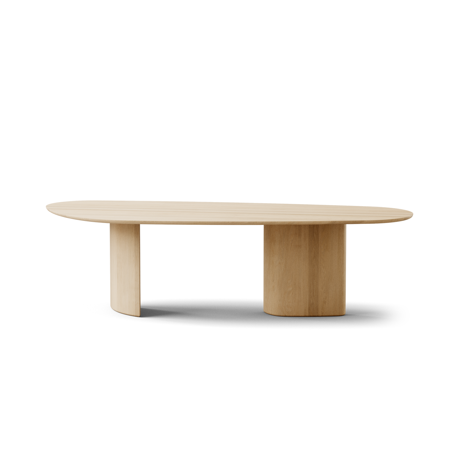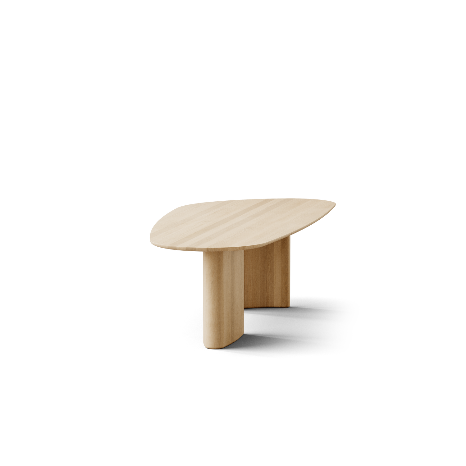 Hvidolieret eg er et oplagt valg, hvis du ønsker et lyst og naturligt udtryk med et diskret skær, der passer smukt ind i skandinaviske interiører. Overfladen er diffust mat og varm at røre ved, og med den rette pleje bevarer den sin fine farve i mange år. Små mærker og patina kan friskes op med let slibning og en ny omgang hvidolie, hvilket gør bordet velegnet til aktiv daglig brug. Samtidig har Tangent en materialemæssig tyngde og en taktil kvalitet, der gør, at bordet kun bliver smukkere i takt med, at træet får liv og historie.