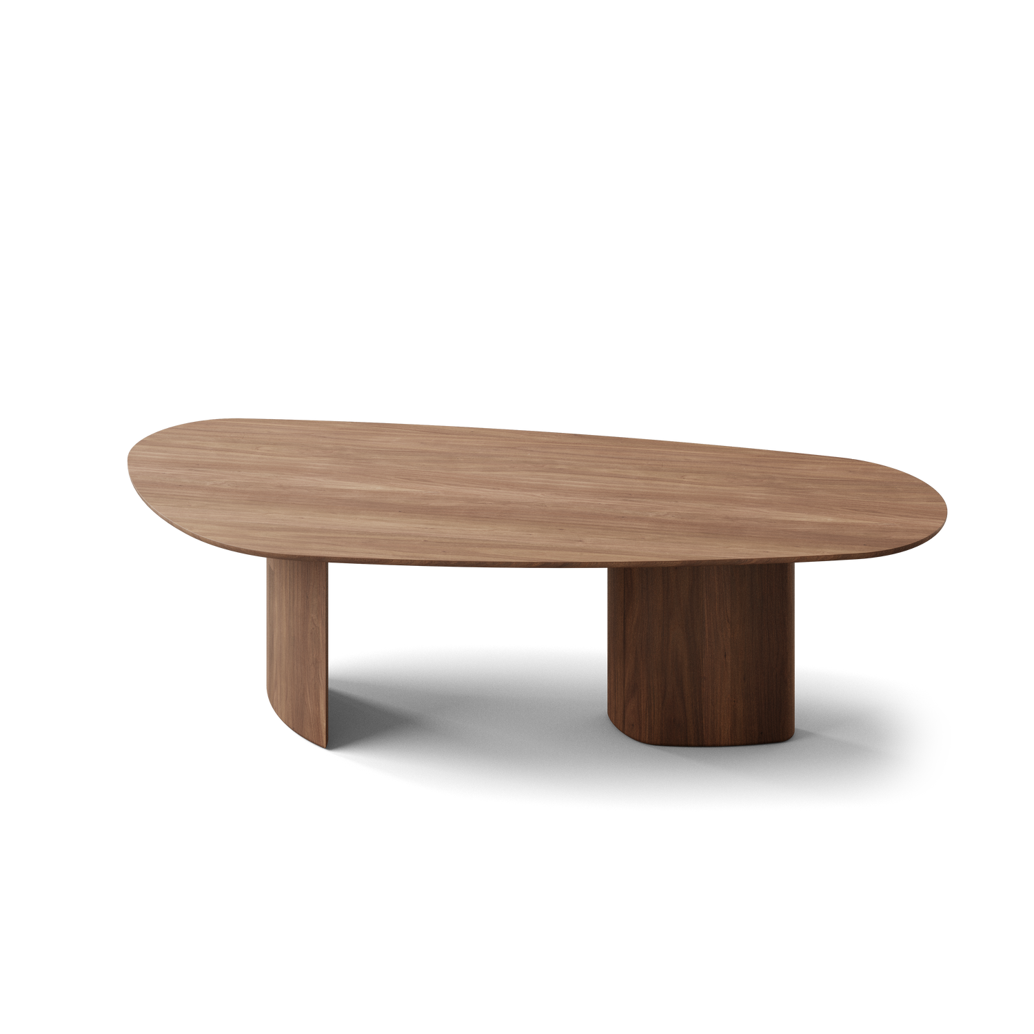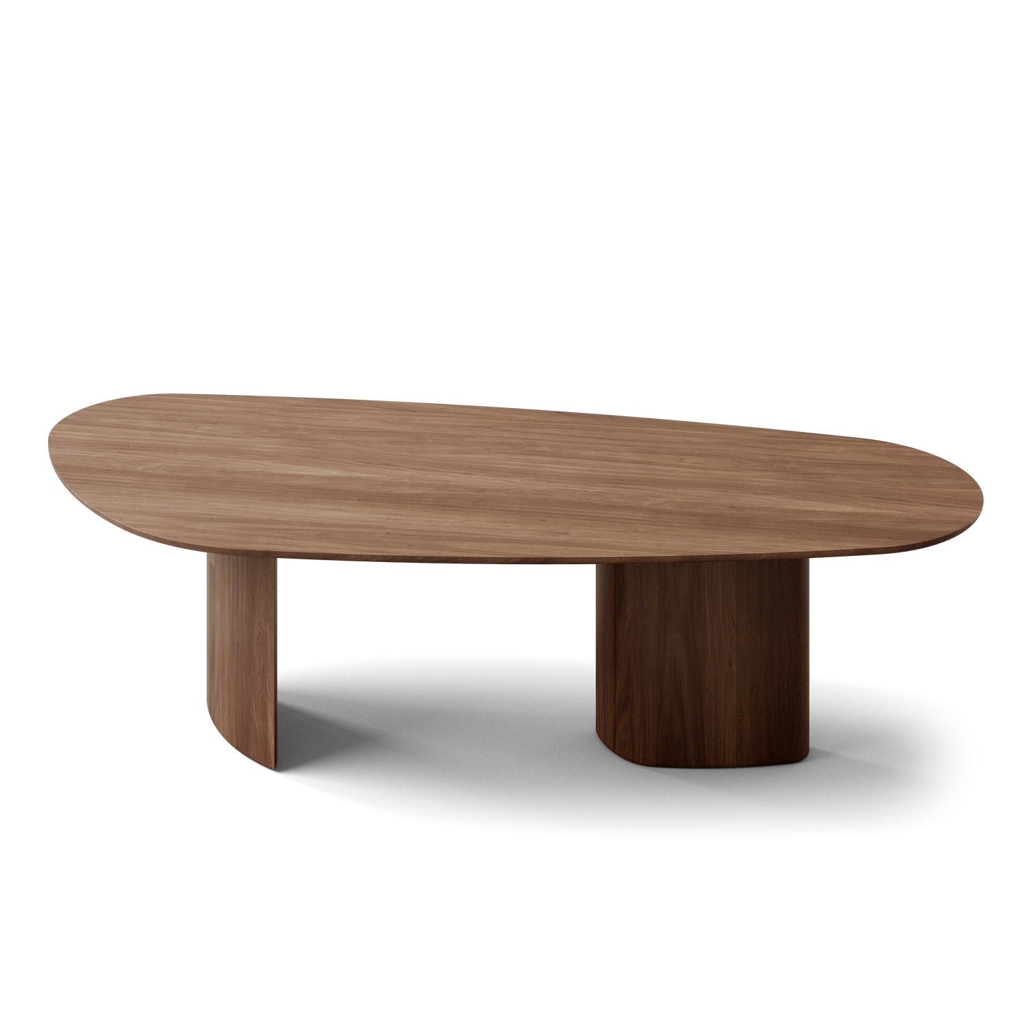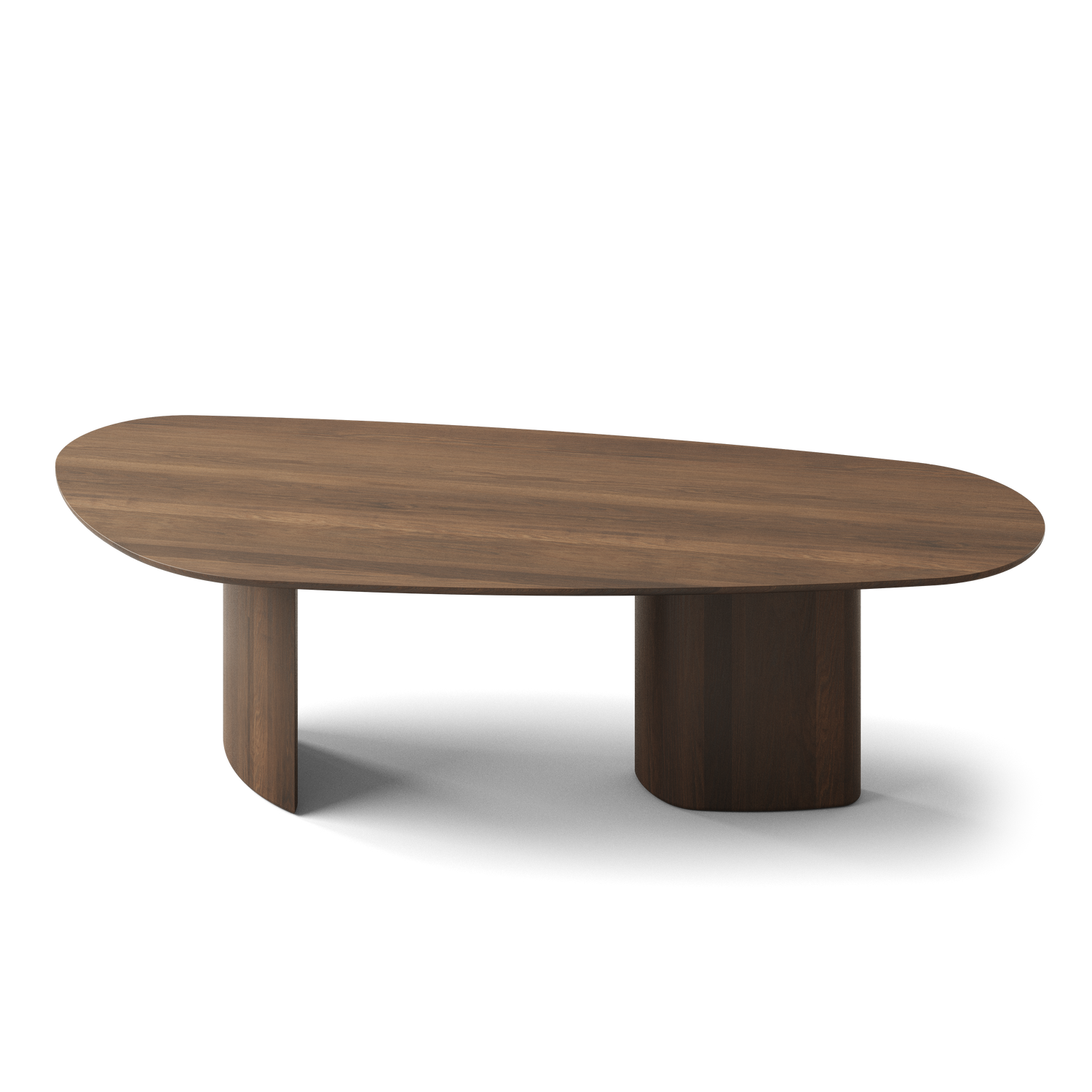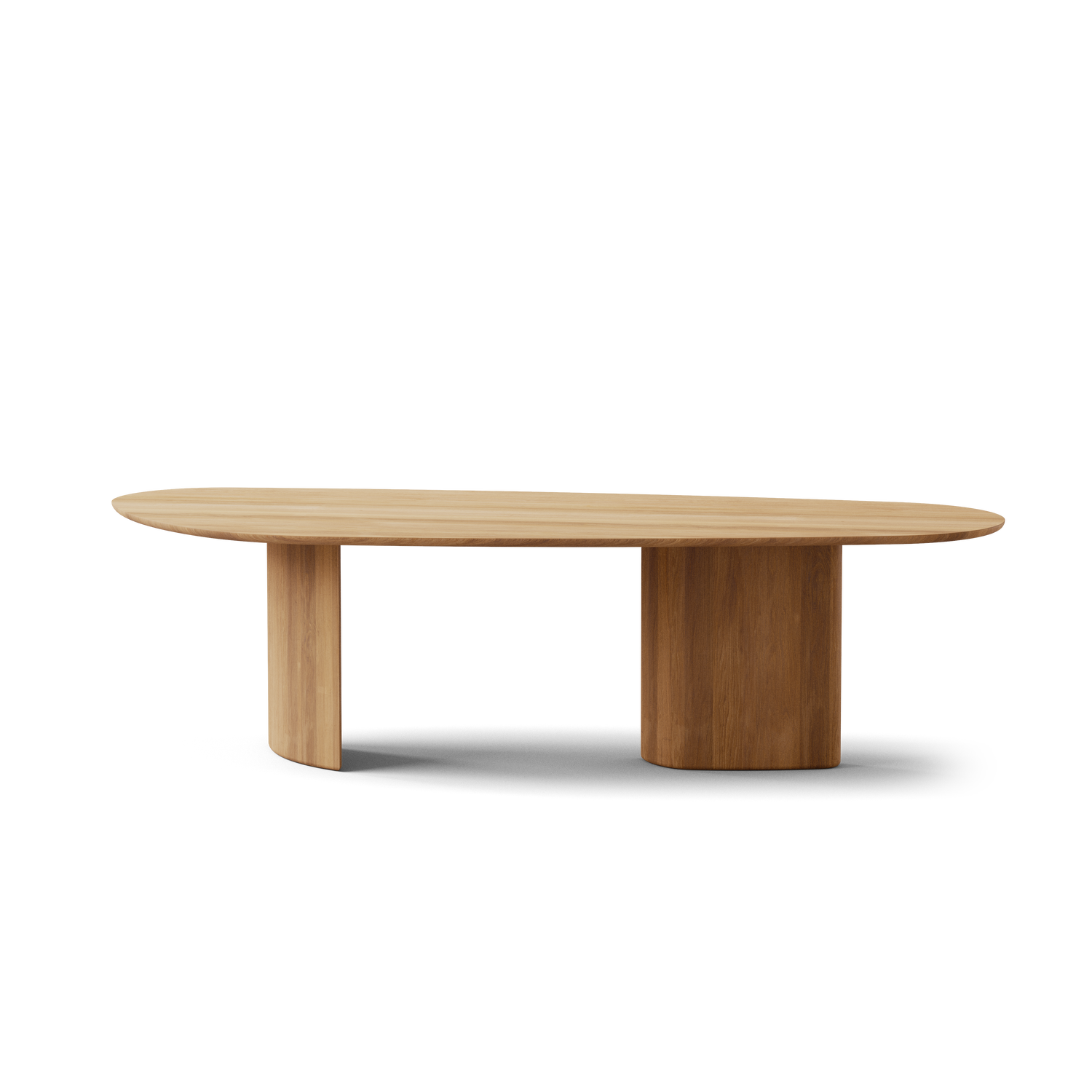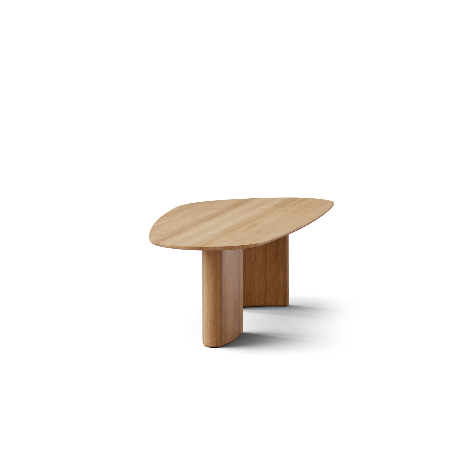 Hvidolieret eg er et oplagt valg, hvis du ønsker et lyst og naturligt udtryk med et diskret skær, der passer smukt ind i skandinaviske interiører. Overfladen er diffust mat og varm at røre ved, og med den rette pleje bevarer den sin fine farve i mange år. Små mærker og patina kan friskes op med let slibning og en ny omgang hvidolie, hvilket gør bordet velegnet til aktiv daglig brug. Samtidig har Tangent en materialemæssig tyngde og en taktil kvalitet, der gør, at bordet kun bliver smukkere i takt med, at træet får liv og historie.
