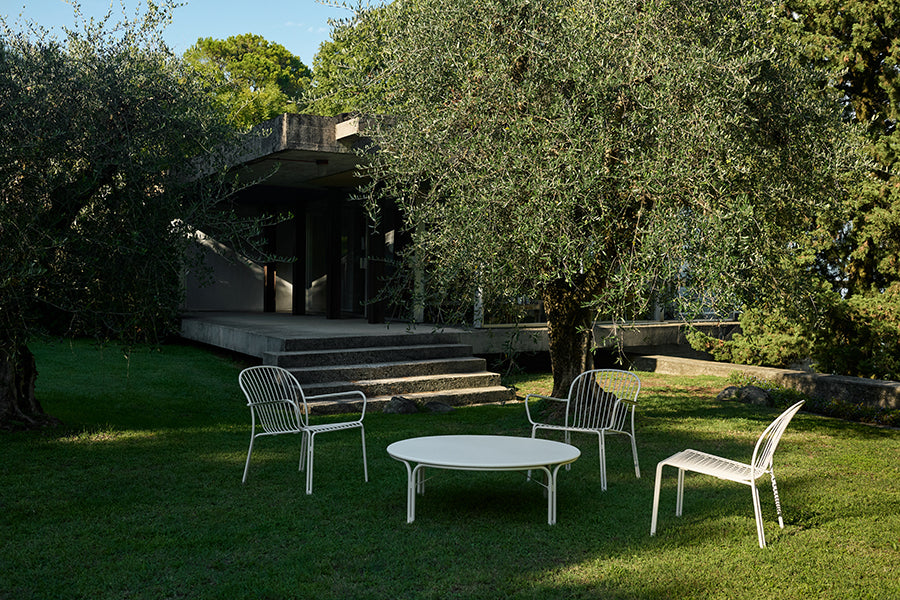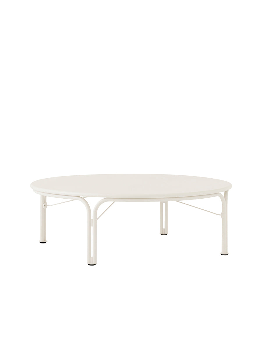 Thorvald SC109 udendørs sofabord fra &Tradition, designet af Space Copenhagen, er skabt til de langsomme stunder under åben himmel. Den store, runde bordplade hviler let på en elegant stålkonstruktion med bløde, rytmiske buer, som giver bordet rolig tyngde og naturlig balance i loungeområdet. Højde og proportioner er afstemt til Thorvald loungestolene, så morgenkaffen, bogen eller aftenens glas altid har en indbydende plads. Resultatet er et skulpturelt midtpunkt, der forlænger udelivet med et blidt, funktionelt udtryk i både private rammer og professionelle miljøer. Bordet er udført i galvaniseret, pulverlakeret stål for at modstå korrosion og sikre en jævn, robust finish.