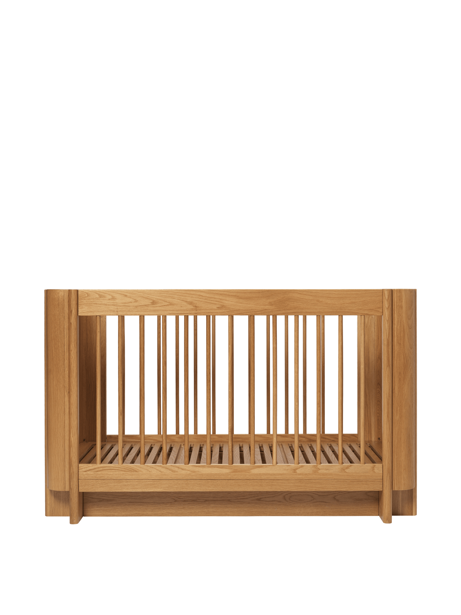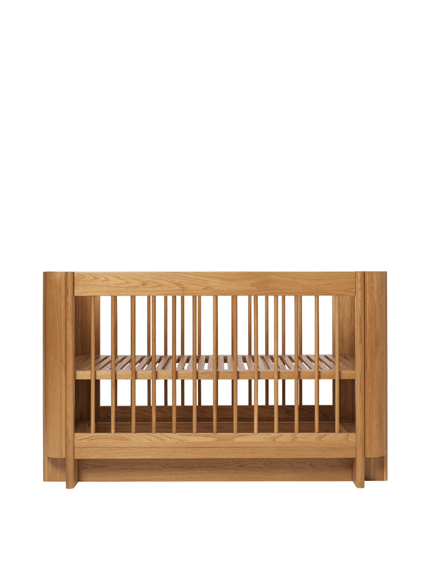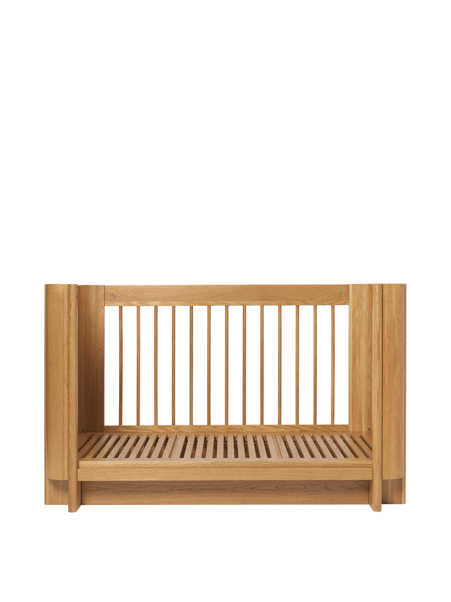 Tilu Baby Cot fra Ferm Living i Natural Oak er en tremmeseng, der er skabt til at give ro fra første dag og samtidig følge dit barn i de år, hvor alting ændrer sig hurtigt. Udtrykket er let og tidløst med bløde linjer og slanke tremmer, der giver både luft og overblik i børneværelset. Den varme egetone gør sengen nem at kombinere med både lyse vægge, tekstiler i naturfarver og mere farverige detaljer, så du kan indrette et rum, der føles trygt, harmonisk og personligt.