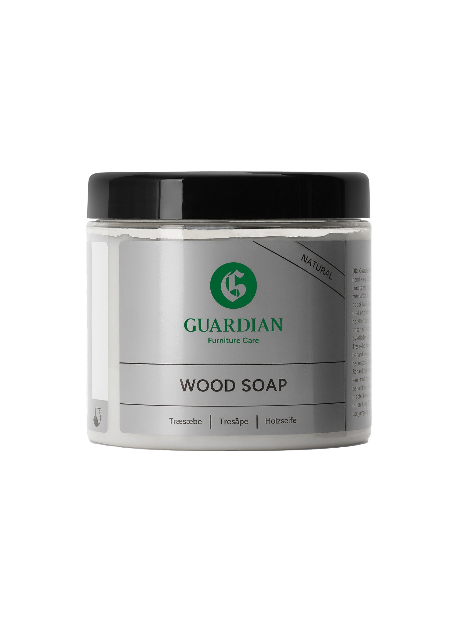 Guardian Træsæbe Natur anvendes til beskyttelse og pleje af ubehandlet eller sæbebehandlet træ. Produktet er kogt på palmekerneolie og kokosolie og indeholder hverken parfume, farve, optisk hvidt eller blegemiddel. Træsæben er færdigblandet og klar til brug. Guardian Træsæbe Natur er testet af Teknologisk Institut og tildelt ”Indeklimamærket”.