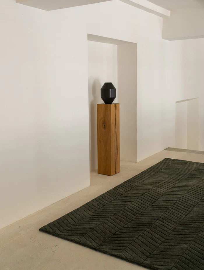 Vein Forest Green fra Massimo bringer naturens ro ind i hjemmet med en dyb, monokrom grøn tone og en elegant, grafisk tekstur. Tæppet er håndtuftet i ren New Zealandsk uld og har et diskret, rytmisk relief der skaber en rolig men levende flade, som både kan stå som et statement i stuen og balancere resten af indretningen. Designet er skabt af Morten Bo Jensen fra Groundwork Studio og henter inspiration i hverdagens spor og overflader, forfinet med arkitektonisk præcision. Resultatet er et blødt, slidstærkt tæppe med tidløs karakter, der løfter materialiteten i rummet og giver en indbydende, sanselig base under sofa, spisebord eller seng.