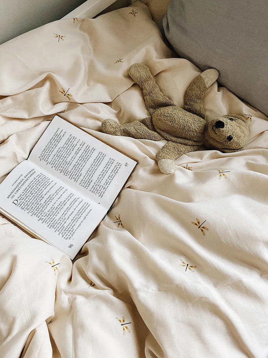 Et smukt sengelinned til børneværelset i det blødeste økologisk satinvævet bomuld. Sengetøjet har fine små guldsmede og kommer også i baby- og voksenstørrelse. Hvert sengetøjssæt er pakket i matchende stofnet, som også kan bruges til at fragte puslesager, legetøj eller skiftetøj til de mindste.