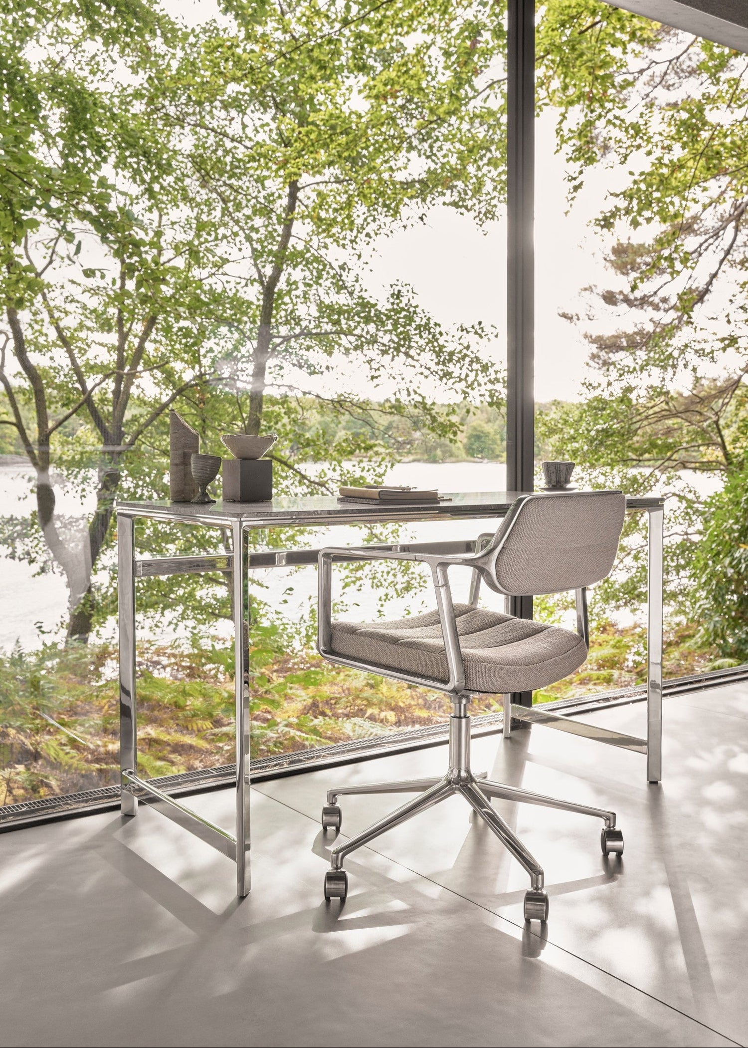 Swivel+ stolen er med polstret sæde og ryg og her med stel i poleret aluminium. VIPP453 stolen er, til forskel fra sin forgænger VIPP452, udstyret med et bredere rygstykke for øget komfort.