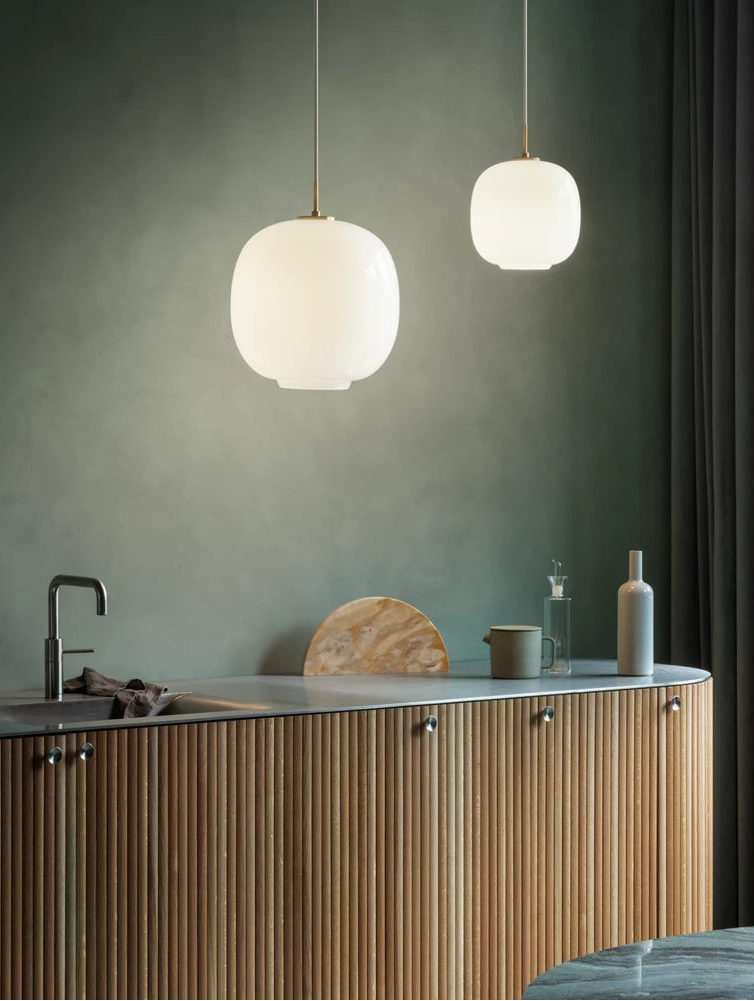 Materiale: Skærm: Mundblæst blankt hvidt opalt glas. Pendelrør: Børstet messing.