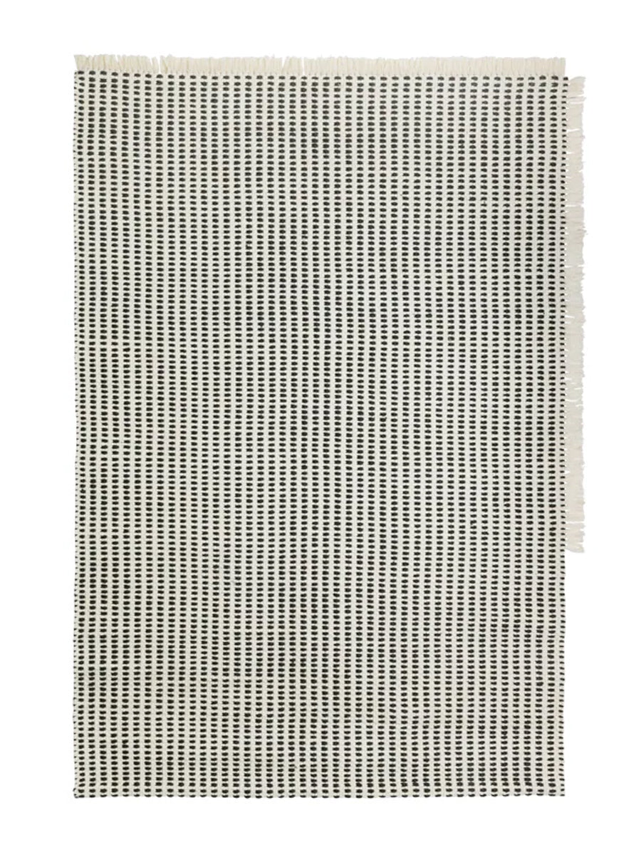 Ved at upcycle brugte plastikflasker præsenterer Way-serien en utrolig holdbar serie af designs, der også kan bruges udenfor. Det vævede, genanvendte polyester giver de enkelte tekstiler en skøn tekstur i farver, der skaber associationer til det maritime. Dette store gulvtæppe har et klassisk udtryk, men med et twist i form af de asymmetriske frynser langs to kanter.