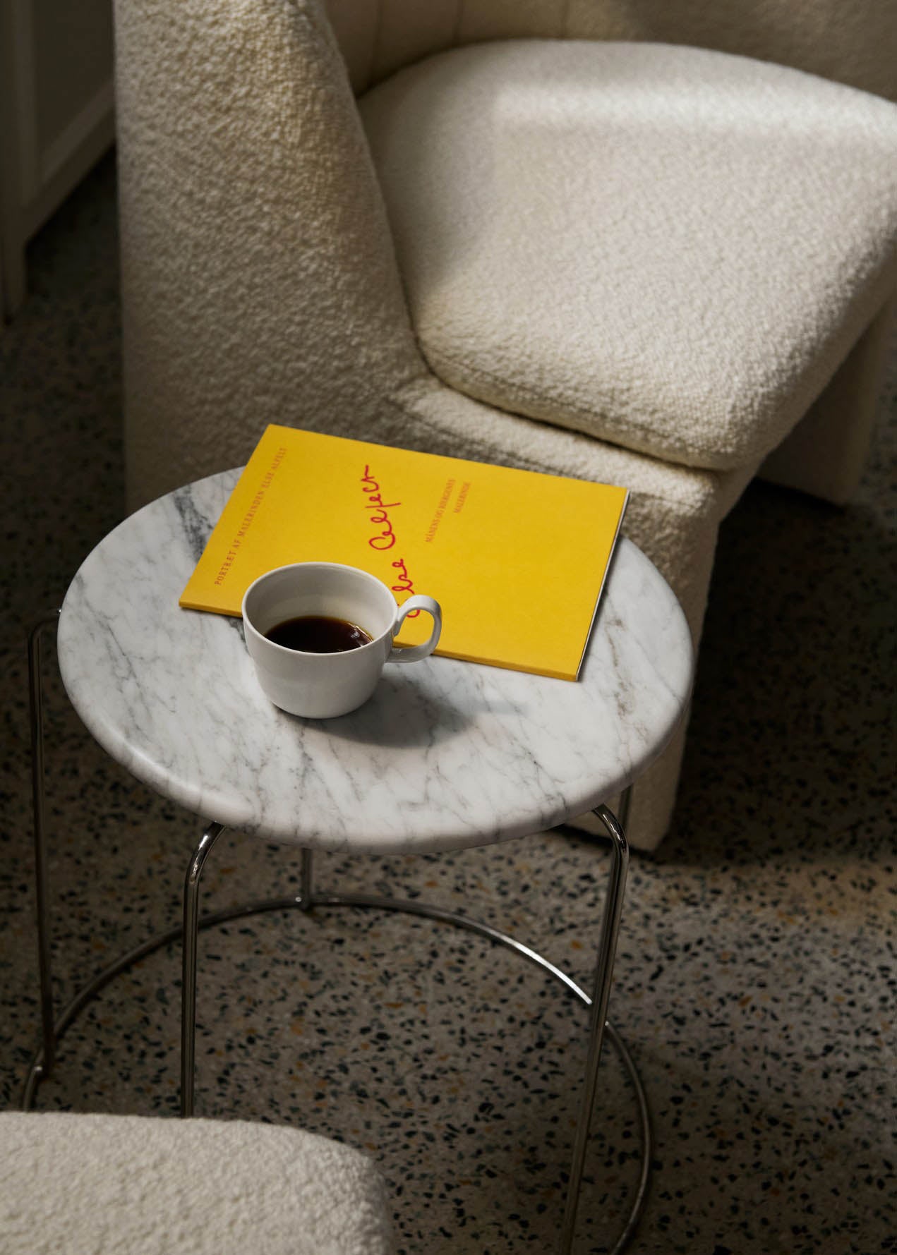 Tilføj en bordplade til din Wire Stool VP11. Den nye marmortop er designet af Verner Panton og blev oprindeligt tegnet i 1981 – nu relanceret af &Tradition. Wire Stool er kendt for sin geometriske lethed og sit grafiske udtryk. Med den præcist tilpassede marmortop forvandles skamlen ubesværet til et elegant sidebord – perfekt til en bog, en kop kaffe eller en drink.