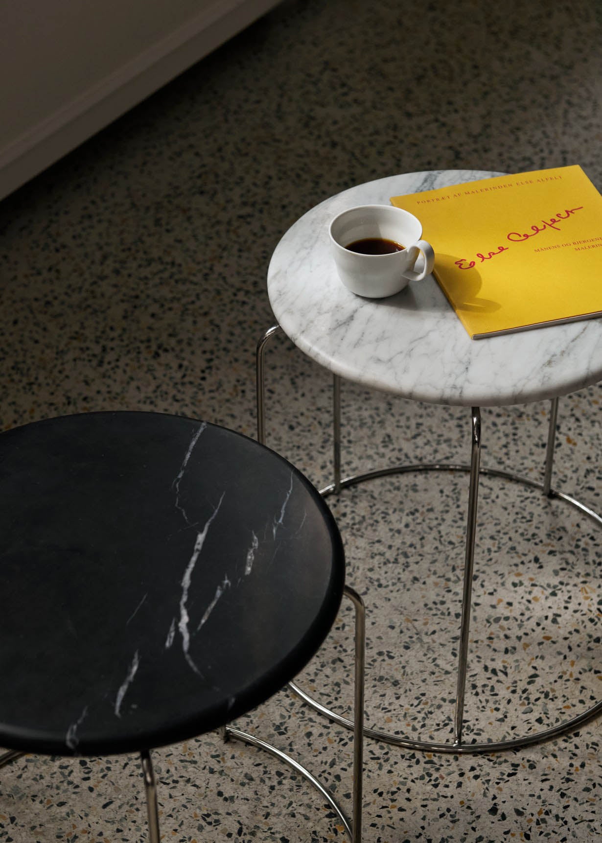 Marmortoppen er tilgængelig i to klassiske varianter: Bianco Carrara og Nero Marquina, begge med en honet, matpoleret finish og beskyttende overfladebehandling. Kombinationen af stålets visuelle lethed og marmorens tyngde fremhæver Pantons leg med kontraster mellem transparens og soliditet.